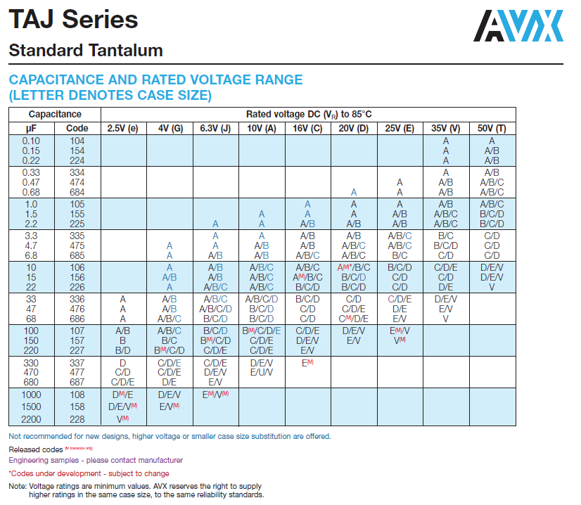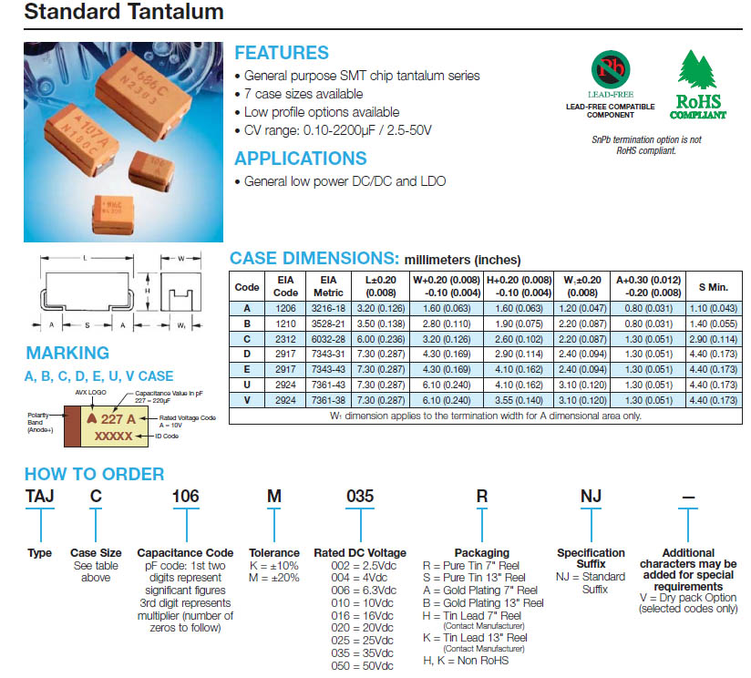 TAJ系列即标准品系列,AVX中最常用的一个系列,是AVX钽电容中性价比最高,市场份额最大的标准品系列。